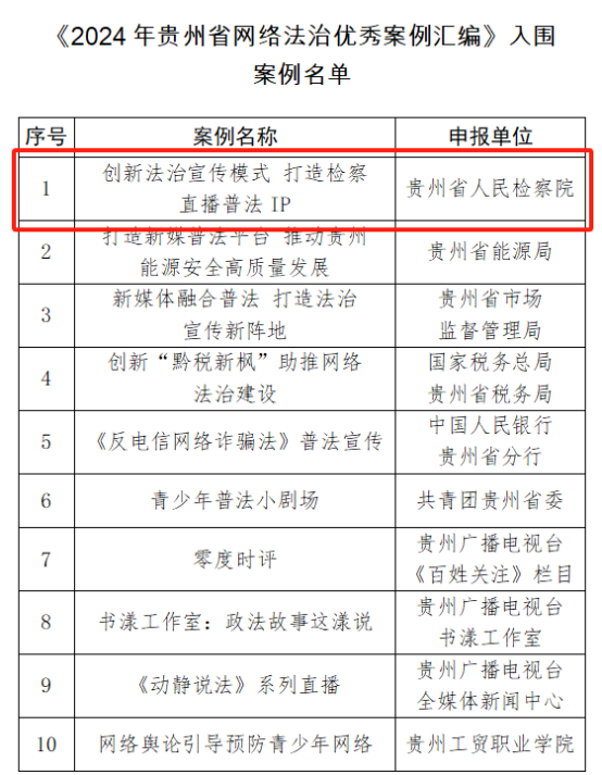由貴州省委網(wǎng)信辦主辦的2024年貴州省網(wǎng)絡(luò)法治優(yōu)秀案例征集活動(dòng)結(jié)果日前揭曉,貴州省人民檢察院的《創(chuàng)新法治宣傳模式 打造檢察直播普法IP》普法宣傳案例成功入選。
