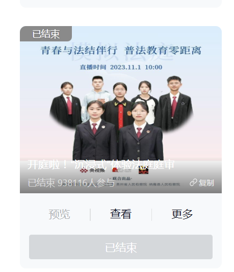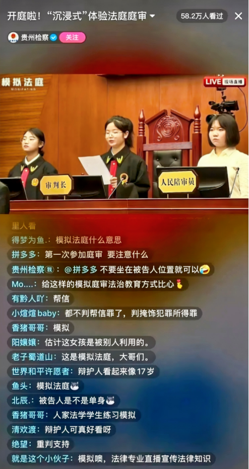貴州省人民檢察院傾力打造“我是檢察官·直播間”原創(chuàng)普法IP,聯(lián)合黨政機(jī)關(guān)、學(xué)校等開(kāi)展普法活動(dòng),打造“檢察官+”普法宣傳模式,通過(guò)模擬法庭、專(zhuān)家講解、互動(dòng)答疑等形式,將司法實(shí)踐與線上直播結(jié)合,讓法律知識(shí)“活”起來(lái),群眾可以沉浸式體驗(yàn)“司法活動(dòng)”和“檢察辦案”等。