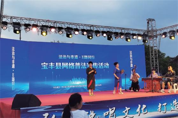 充分利用馬街書會活動規(guī)模大、人流量大的特點,將“法治與非遺 E路同行”網絡普法宣傳活動舉辦地安排在馬街中華曲藝展覽館,精心設置舞臺展演、展板宣傳、現(xiàn)場互動等活動內容,還通過寶豐生活網、直播鷹城等新媒體賬號進行直播,打造“有節(jié)目、有場地、時時有、隨時看”的網絡普法宣傳“寶豐品牌”。(馬街書會作為中國最大的民間曲藝大會,被譽為“中國十大民俗”之一,是全縣最具代表性的文化空間,群眾基礎廣泛。)