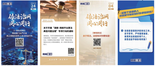 一是做好網(wǎng)信法制建設(shè)展示和解讀。圍繞網(wǎng)絡(luò)領(lǐng)域重點(diǎn)法律法規(guī)和規(guī)章規(guī)定,推出多種形式的原創(chuàng)產(chǎn)品15個(gè),實(shí)現(xiàn)權(quán)威內(nèi)容的新媒體轉(zhuǎn)化。圍繞《促進(jìn)和規(guī)范數(shù)據(jù)跨境流動(dòng)規(guī)定》推出圖解產(chǎn)品《行為鑒別:關(guān)于數(shù)據(jù)跨境流動(dòng)的那些事兒》;根據(jù)《網(wǎng)絡(luò)暴力信息治理規(guī)定》推出圖組海報(bào)《為網(wǎng)暴信息治理提供有力支撐!這些亮點(diǎn)值得關(guān)注》。