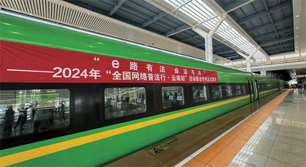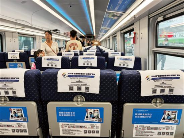 一是打造主題車廂。聚焦“一帶一路”網(wǎng)絡空間安全和沿線群眾在網(wǎng)絡法治領域的熱點問題,根據(jù)復興號CR200J的車型特點,設置“中國網(wǎng)絡法治三十年”“網(wǎng)絡安全”“數(shù)據(jù)安全”“未成年人網(wǎng)絡保護”“數(shù)據(jù)出境之旅”“反網(wǎng)暴凈網(wǎng)行動”“個人信息守護”以及“網(wǎng)絡空間命運共同體”8節(jié)主題車廂,讓車廂內(nèi)部成為網(wǎng)絡普法移動走廊,突出展示新時代中國網(wǎng)絡法治建設理念、實踐成效及交流成果。二是豐富法治內(nèi)容。充分利用車廂內(nèi)鏡框海報、玻璃貼、小桌板貼、行李架彩貼、頭枕片、LED顯示屏等豐富多彩的載體,以口訣、順口溜、圖片、漫畫、金句等形式展示網(wǎng)絡法律知識,打造輕松愉快的移動式學法場景,讓乘客們在享受舒適旅途的同時,也能輕松學習到實用的法律知識,共推出普法圖片50張,漫畫20幅,金句48條。三是互動掃碼學法。在每個座位的頭枕片上印制“法潤彩云南你我共參與”網(wǎng)絡法治競賽二維碼,方便群眾可隨時掃碼開展趣味學法,參與便捷、實用性強,為移動化碎片式學法提供新途徑,吸引246.5萬人次參與答題,訪問量累計超645.8萬次。