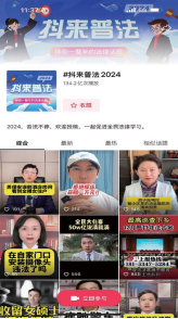 抖音“抖來普法”系列活動,年度話題播放量超百億,頭部法律作者對活動的參與率高達95%,最高法、最高檢等公檢法司政務(wù)機構(gòu)也積極參與。截至2024年12月,#抖來普法2024年度長線普法系列活動,播放量134.2億次,共計上萬名法律創(chuàng)作者發(fā)布相關(guān)內(nèi)容。系列活動如下:
