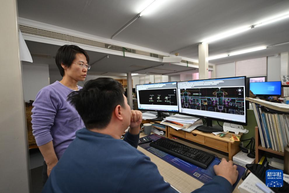 在天津陳塘科技商務(wù)區(qū)天津方標(biāo)世紀(jì)規(guī)劃建筑設(shè)計(jì)有限公司,設(shè)計(jì)人員在繪圖討論(3月26日攝)。
