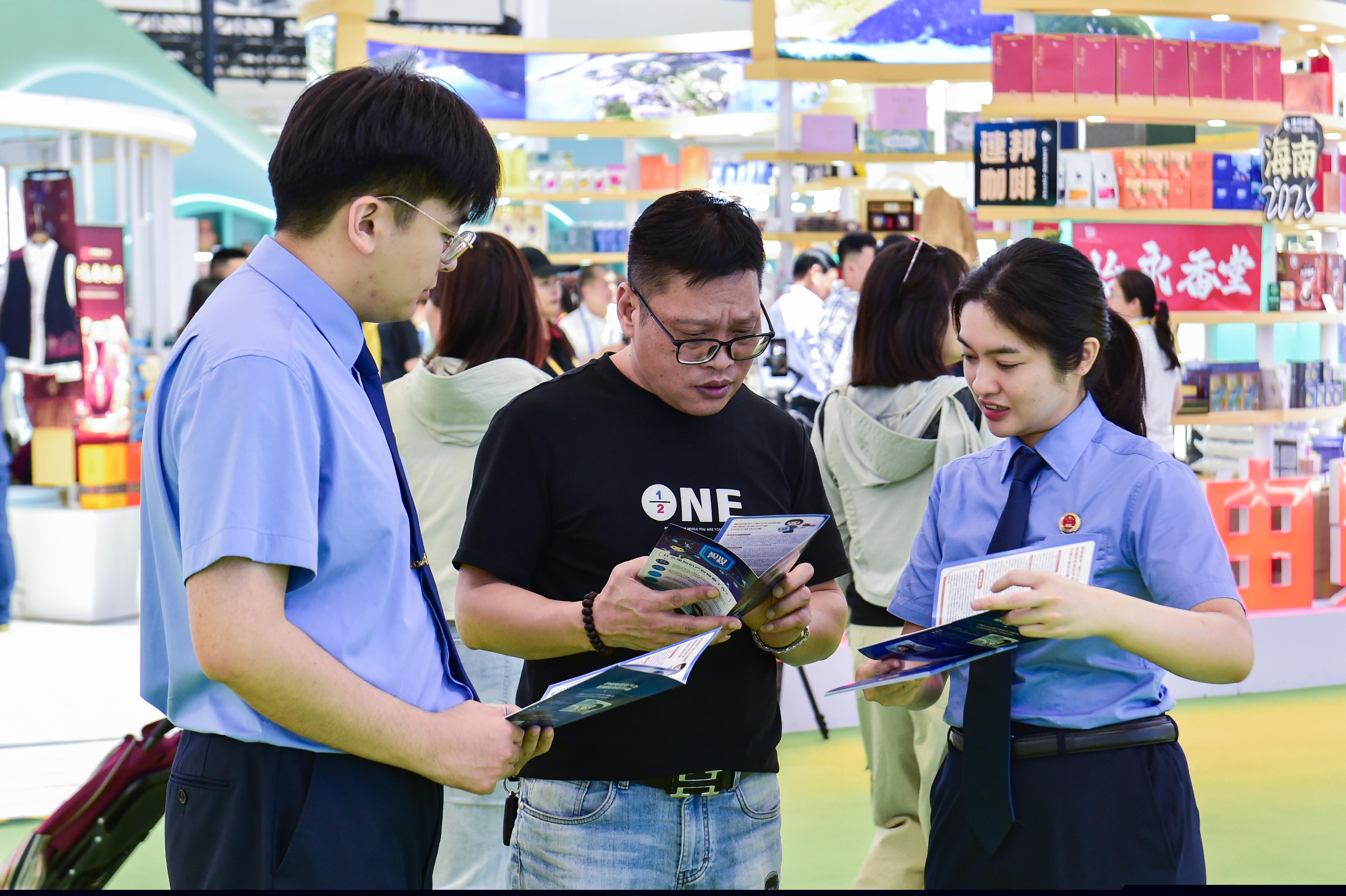 作為消博會人員最密集的區(qū)域,登陸大廳是消費者進入展館的“第一站”。本屆消博會,省檢察院指派省檢察院第一分院和??谑行阌^(qū)檢察院業(yè)務(wù)骨干進駐登陸大廳知識產(chǎn)權(quán)保護工作站,設(shè)立“知識產(chǎn)權(quán)檢察服務(wù)專區(qū)”,開展知識產(chǎn)權(quán)保護服務(wù)和普法宣傳工作。同時,檢察干警還深入各場館,主動與參展客商進行交流,深入了解知識產(chǎn)權(quán)保護方面新需求、新動向,并針對較為關(guān)注的商標保護、商標侵權(quán)維權(quán)、侵犯商業(yè)秘密等問題,逐一耐心細致解答,精準提供快捷高效的維權(quán)途徑和解決方案,為消博會創(chuàng)造法治化營商環(huán)境。