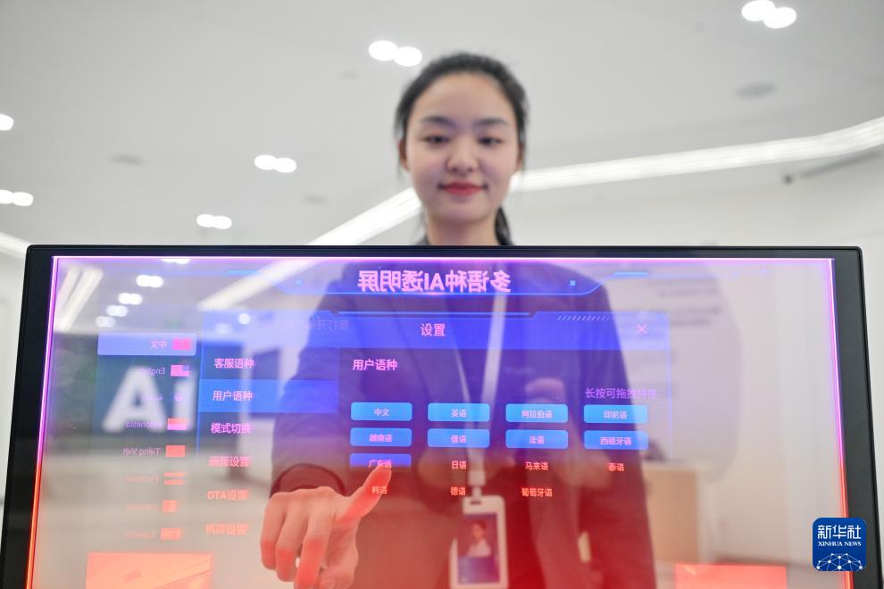 在科大訊飛天津公司,工作人員演示多語(yǔ)種AI透明屏實(shí)時(shí)翻譯系統(tǒng)(4月18日攝)。