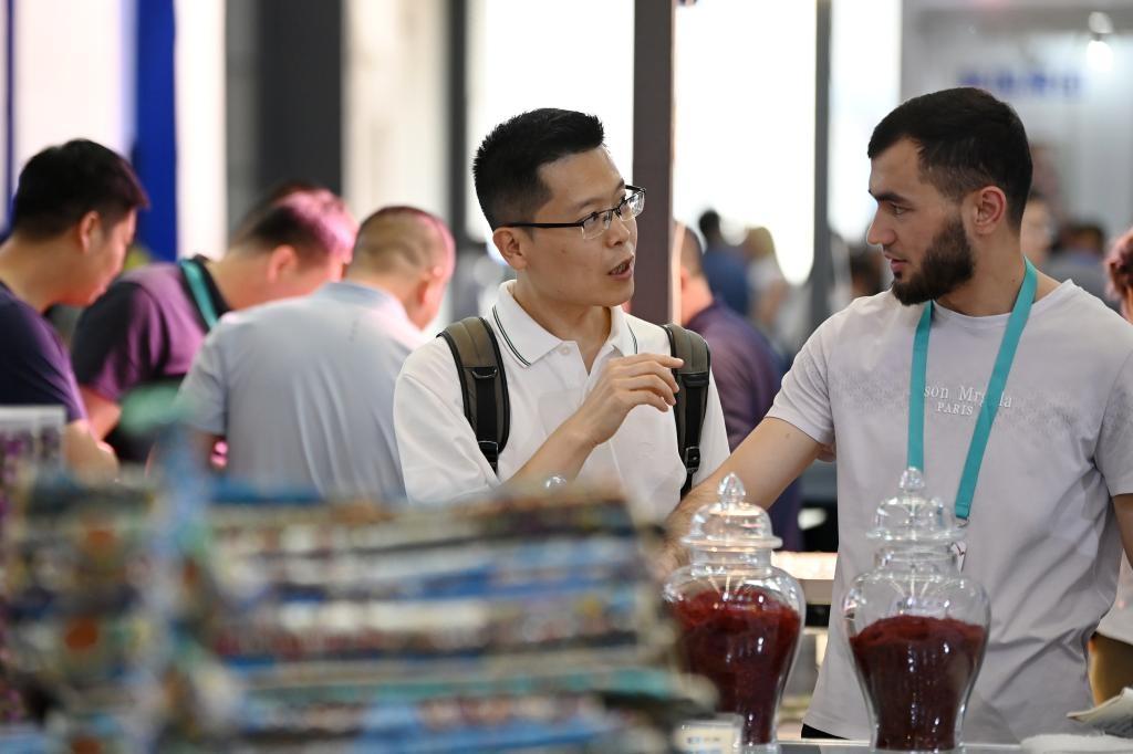 5月21日,在第九屆絲綢之路國(guó)際博覽會(huì)暨中國(guó)東西部合作與投資貿(mào)易洽談會(huì)絲路優(yōu)品展上,參觀者與參展商交流。新華社記者 李一博 攝