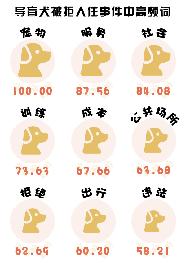(數(shù)據(jù)來源:選取嗶哩嗶哩視頻《炒作、稀缺、奢侈品?為什么導(dǎo)盲犬被噴成了一場騙局?》下的6949條一級評論及彈幕,做分詞及歸一化處理,進行分詞后將熱度最高的詞語規(guī)定為100)
