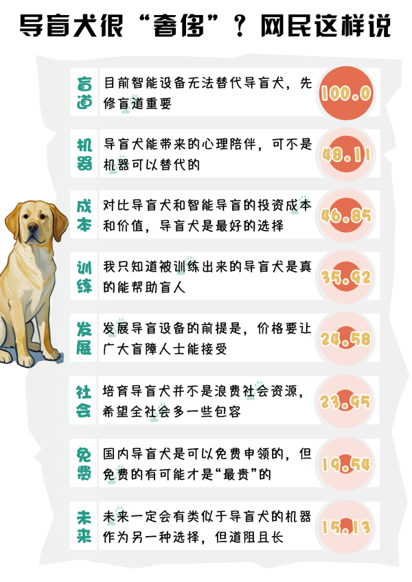 數(shù)據(jù)顯示,培訓(xùn)一條導(dǎo)盲犬的成本約20萬元,有人戲稱其是“奢侈品”。其實,導(dǎo)盲犬是免費給視障人士使用的,其養(yǎng)護、醫(yī)療等成本與寵物犬相差并不大。輿論場中,網(wǎng)民對于導(dǎo)盲犬的價值討論呈現(xiàn)截然不同看法。