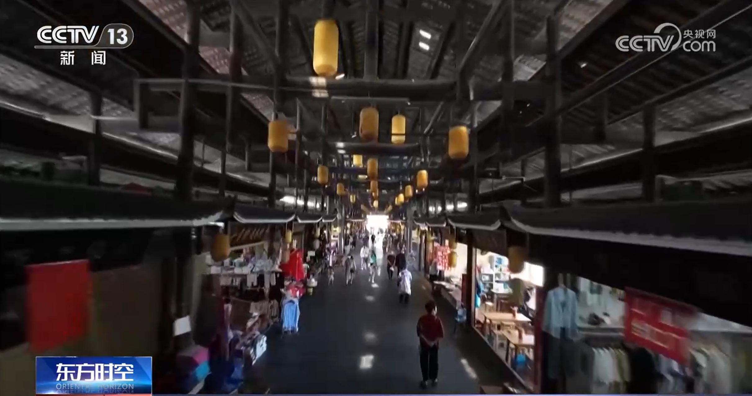 跟隨無人機(jī)的視角穿過湖南芷江,龍津風(fēng)雨橋如一條巨龍橫跨?水河,它全長246.7米、寬12.2米。這座風(fēng)雨橋橋墩形似“龍口噴津”,龍津橋因此而得名。龍津橋上,三重檐的廊道與五重檐的亭閣錯落有致,深藍(lán)色琉璃瓦與白色檐口相映成趣。