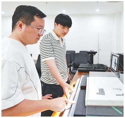 實(shí)驗(yàn)室內(nèi),張展(左)正在和學(xué)生掃描錄入甲骨文拓本。 霍亞平攝