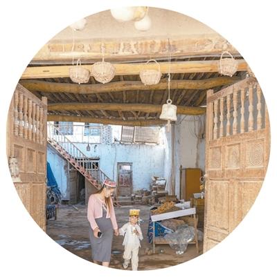 三個橋村,因村民們曾在村中河渠上修建三座小橋而得名。走進三個橋村,能鮮明地感受到當?shù)囟嘣幕蝗诮粎R的特征。土色圍墻的上部是一圈十字形鏤空,這種建筑元素取自當?shù)爻R姷钠咸蚜婪?,而民居大門上艷麗的色彩為當?shù)厝罕娝矏郏书T上的圖案各有不同,有山水動物,也有各色花草。