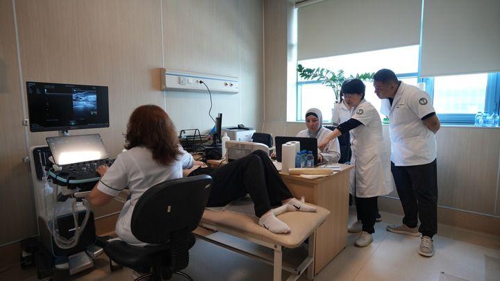 7月16日,天津市抗癌協(xié)會、天津醫(yī)科大學(xué)腫瘤醫(yī)院的醫(yī)療隊專家在阿塞拜疆與當(dāng)?shù)蒯t(yī)院的超聲醫(yī)生聯(lián)合開展乳腺癌篩查。宋瑞 攝