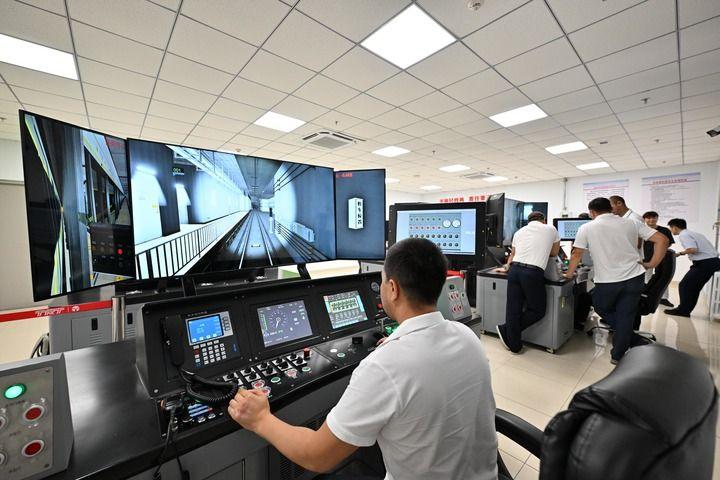 哈薩克斯坦阿斯塔納首條輕軌列車的駕駛員學(xué)員在天津地鐵10號線車輛維修基地進行地鐵模擬駕駛培訓(xùn)。(新華每日電訊記者孫凡越攝)