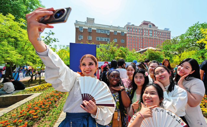 中外青年在以“上合之約 天外同彩”為主題的天津外國語大學第八屆國際文化節(jié)上合影留念(2025年4月20日攝)孫凡越攝/本刊