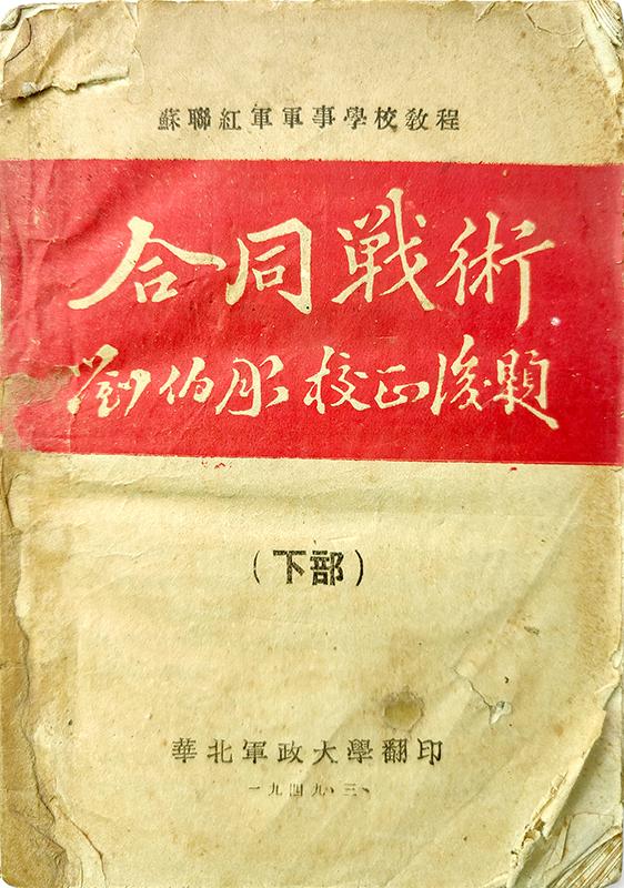 《合同戰(zhàn)術》,蘇聯(lián)紅軍軍事學校教程,系統(tǒng)論述多兵種戰(zhàn)斗特性和協(xié)同作戰(zhàn),是劉伯承等人著眼于人民軍隊未來戰(zhàn)術的發(fā)展,在戰(zhàn)斗間隙精心翻譯出來的。