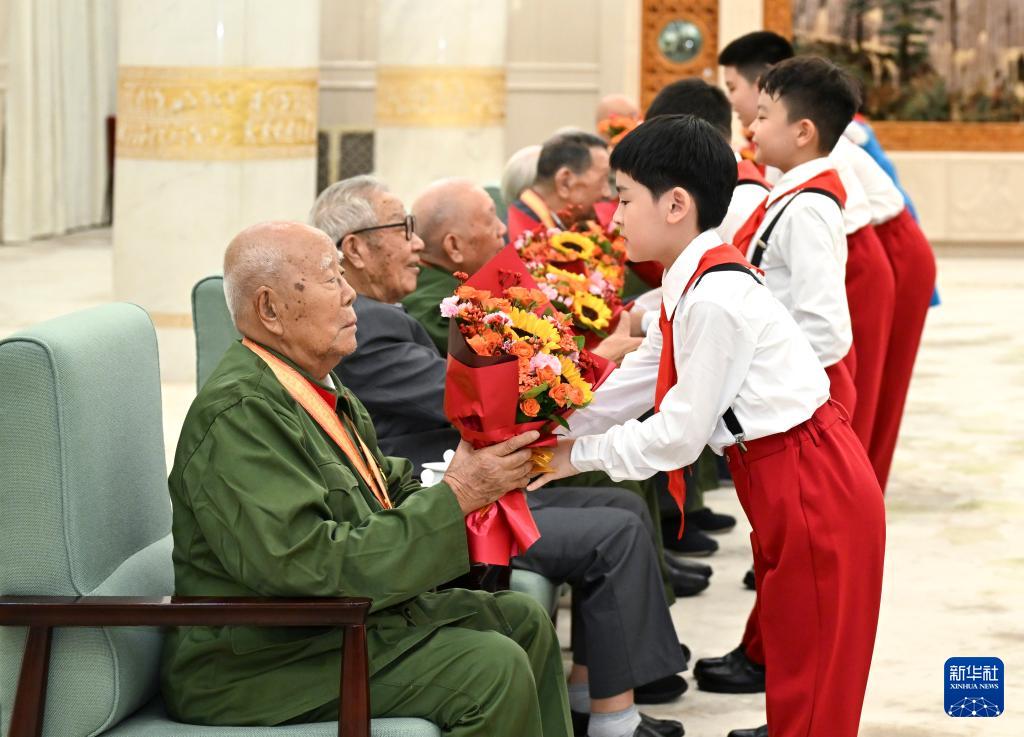 9月3日晚,紀念中國人民抗日戰(zhàn)爭暨世界反法西斯戰(zhàn)爭勝利80周年文藝晚會《正義必勝》在北京人民大會堂隆重舉行。這是晚會開始前,少先隊員向前來觀看演出的抗戰(zhàn)老戰(zhàn)士老同志代表獻花。