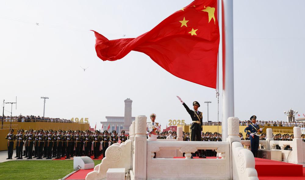 2025年9月3日,紀(jì)念中國(guó)人民抗日戰(zhàn)爭(zhēng)暨世界反法西斯戰(zhàn)爭(zhēng)勝利80周年大會(huì)在北京隆重舉行。這是天安門(mén)廣場(chǎng)舉行隆重的升國(guó)旗儀式。新華社記者 費(fèi)茂華 攝