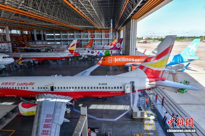 圖為多架進境維修飛機正在海南自貿(mào)港一站式飛機維修產(chǎn)業(yè)基地內(nèi)進行全面檢修。 中新網(wǎng)記者 駱云飛 攝