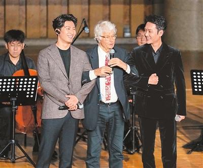 電影《狼圖騰》導演讓-雅克·阿諾(前排左二)與中國演員馮紹峰(前排右一)、竇驍在“光影百年·中法同行”電影音樂會上互動。 新華社記者 謝晗攝