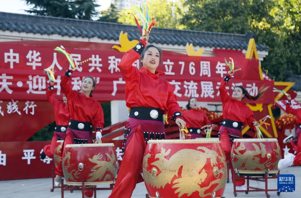 9月25日,在河南省洛陽市汝陽縣劉伶廣場,汝陽縣牡丹藝術(shù)團(tuán)在表演音樂鼓《中華魂》。