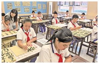 圖為九月十一日,新疆維吾爾自治區(qū)哈密市豫哈第三實(shí)驗(yàn)學(xué)校學(xué)生在寬敞整潔的書(shū)法教室里臨摹學(xué)習(xí)書(shū)法。