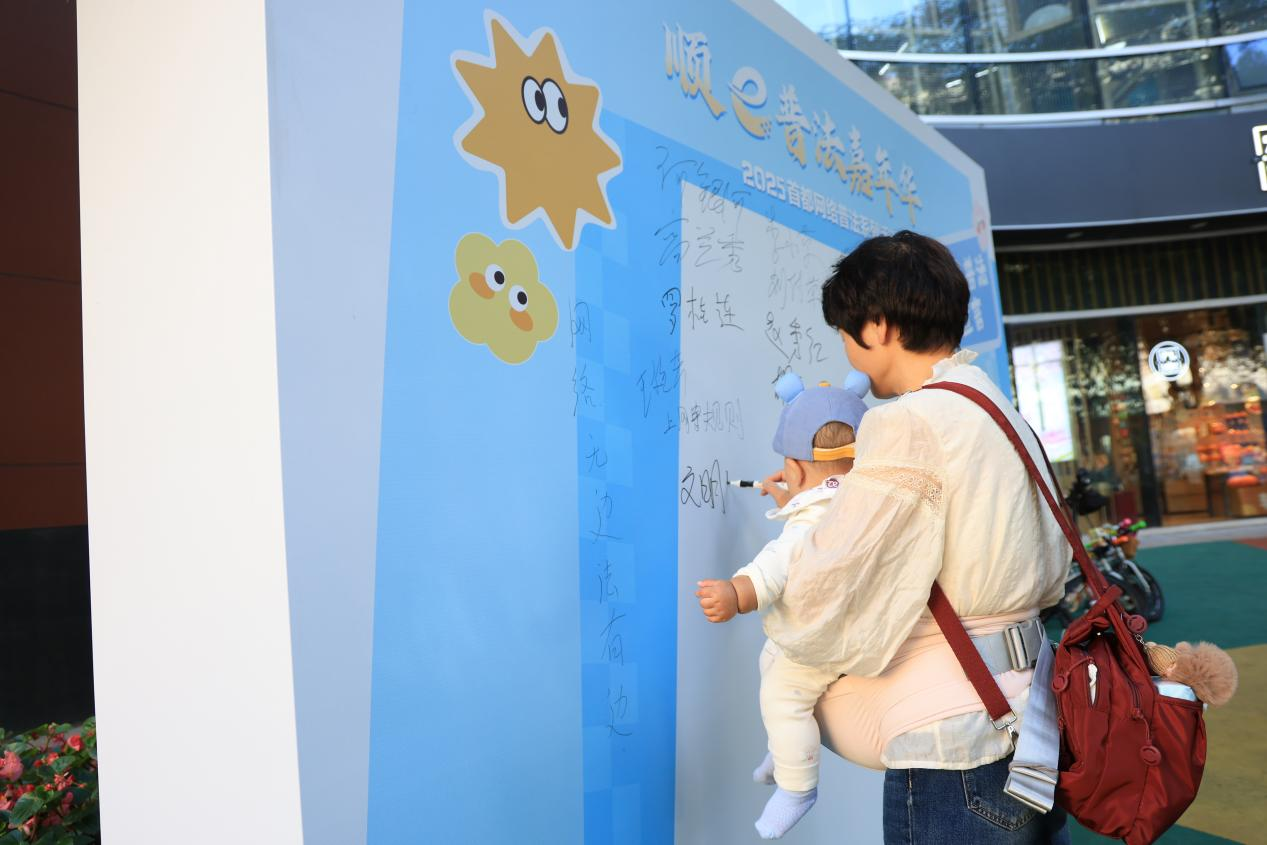 “e言e行皆風景,e舉e動講文明”“清朗網(wǎng)絡風,法治來護航”等一條條醒目標語在“網(wǎng)絡普法宣言”墻上漸漸被填滿,市民朋友們手持“e法潤京華”“順e普法嘉年華”主題KT板合影留念。在中國生活多年的外籍居民謝夫,特意趕來參與這場特別的“法治派對”,并在“網(wǎng)絡普法宣言”墻上寫下自己的名字?!斑@樣的活動很有意義,能讓更多人了解怎么依法上網(wǎng)?!敝x夫說。