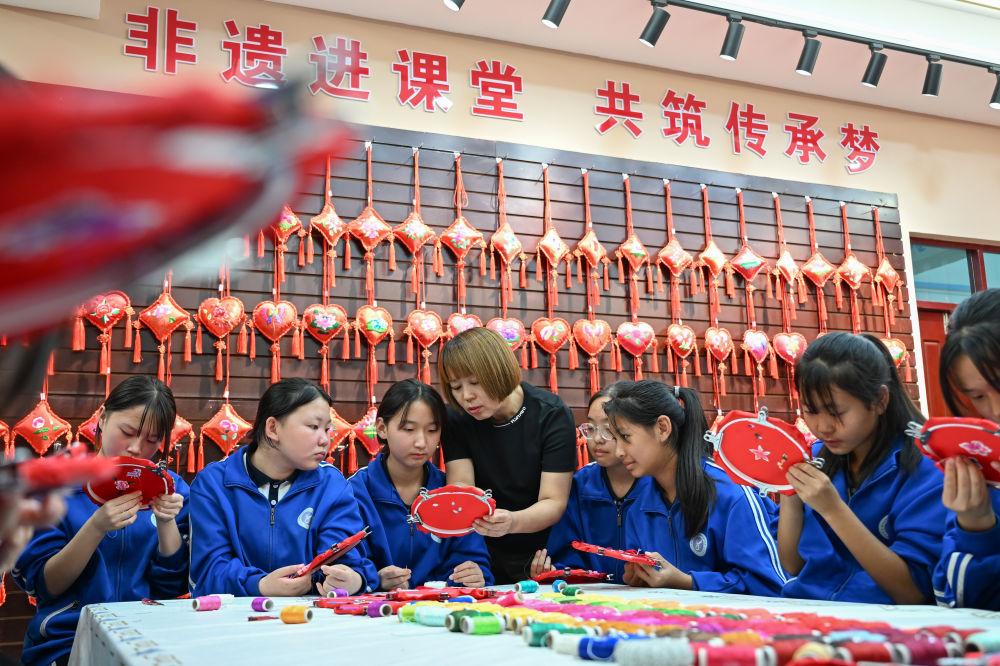 2025年9月26日,內(nèi)蒙古興安盟科右中旗巴彥呼舒第六中學(xué)美術(shù)教師、非遺傳承人吳斯琴(左四)指導(dǎo)學(xué)生刺繡。近年來,學(xué)校將當(dāng)?shù)貒壹壏沁z圖什業(yè)圖刺繡引入校園,開設(shè)課程,并成立興趣社團(tuán),讓學(xué)生們近距離感受非遺的魅力,弘揚和傳承傳統(tǒng)文化。
