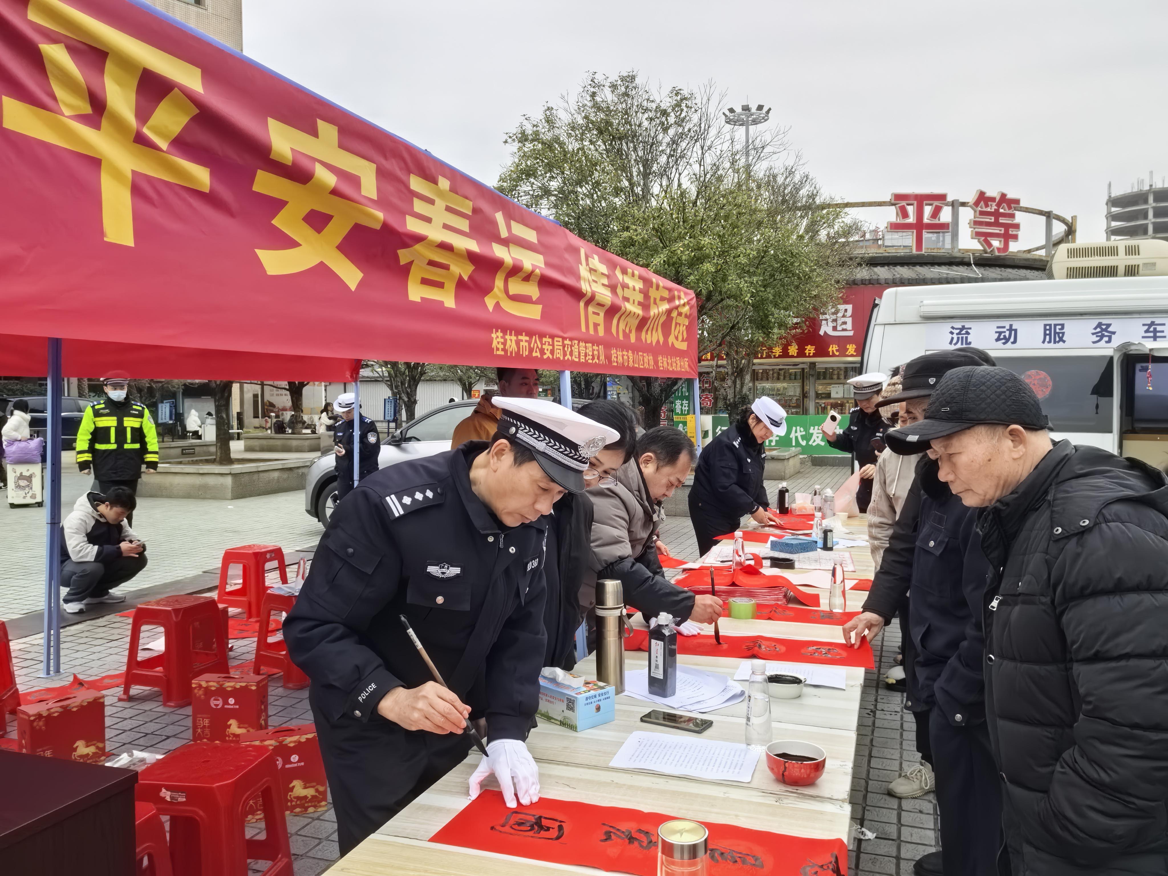 桂林市公安局交管支隊民警在“平安春運 情滿旅途”主題活動現(xiàn)場,為旅客現(xiàn)場書寫交通安全春聯(lián)。