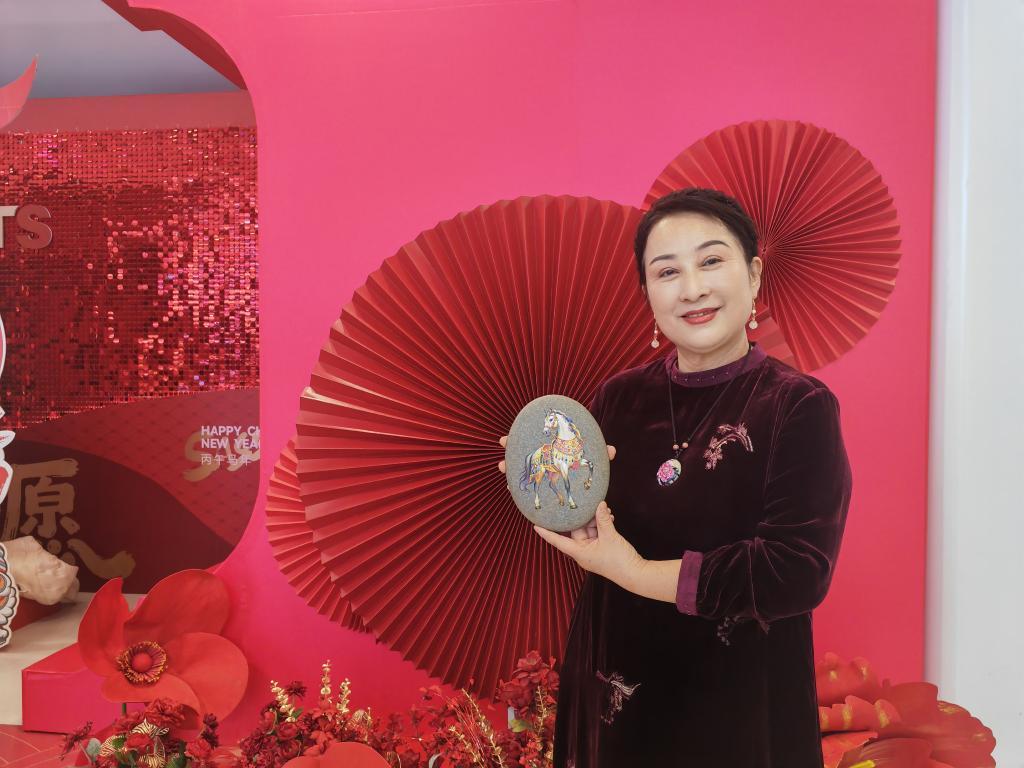 2月7日,宋笑珍攜帶自己專為馬年春節(jié)創(chuàng)作的黃河石畫系列作品亮相2026年“在寧夏·非遺過大年”文旅系列活動啟動儀式。形態(tài)各異、色彩不同的馬與黃河石有機融合,展現(xiàn)出蓬勃向上的精氣神?!拔覄?chuàng)作這些作品,就是希望能把非遺和年俗結(jié)合,給大家送去美好祝愿?!彼f。