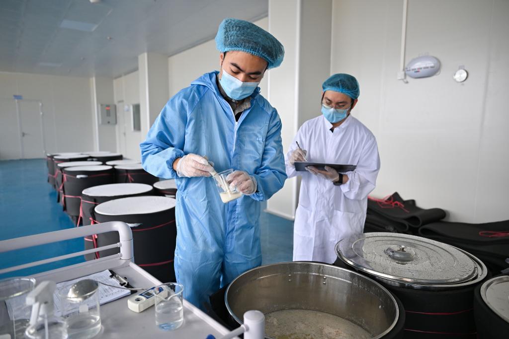 2026年1月28日,海南文昌溪北邦興食品科技有限公司糟粕醋加工廠的工作人員正在對糟粕醋進(jìn)行采樣檢測。新華社記者郭程 攝