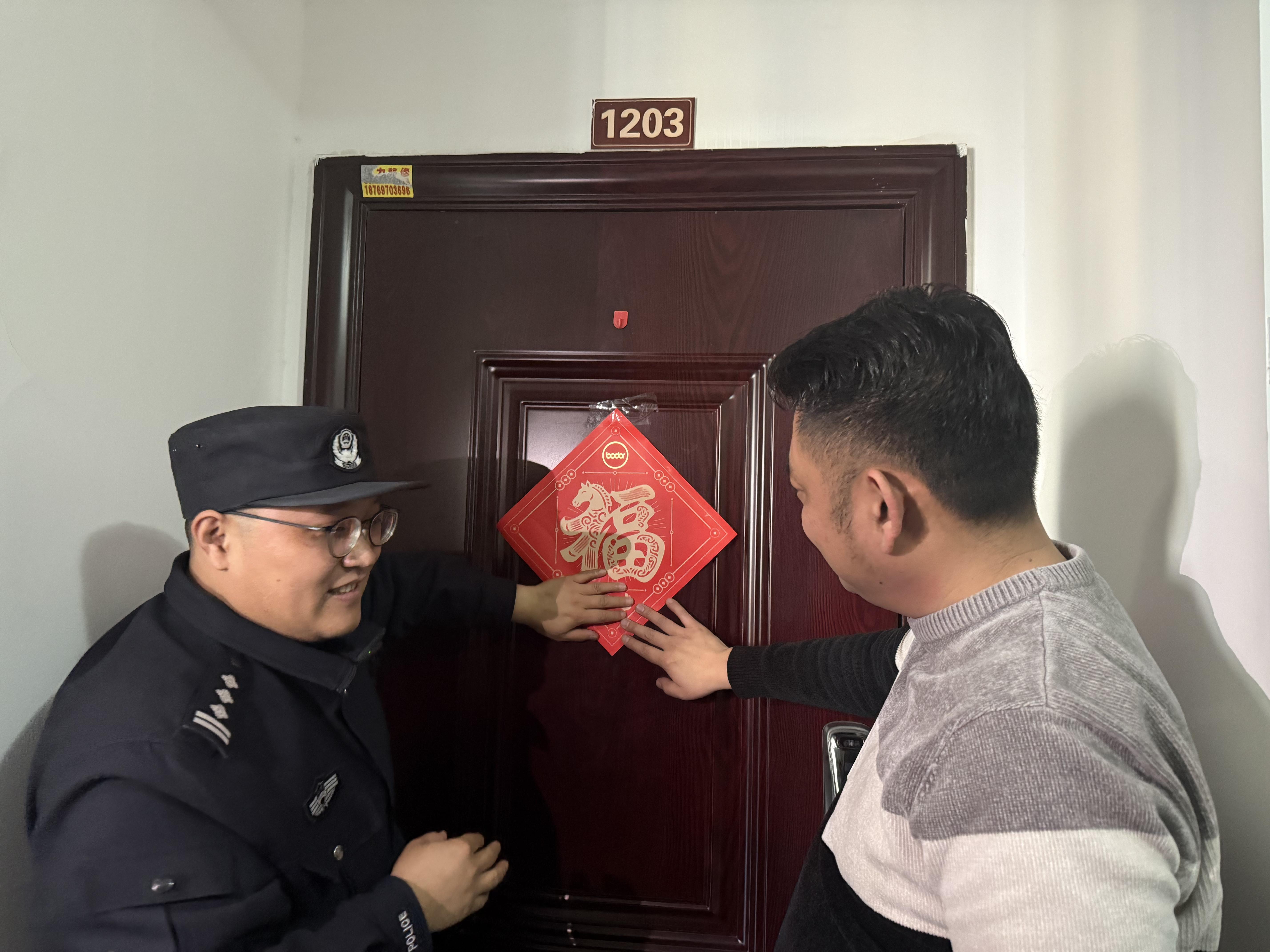 隨后,記者跟隨孫成磊來到虞山新居走訪。清理墻角堆放的紙箱、廢舊家具等易燃雜物,檢查消防栓是否完好無損、應(yīng)急通道是否暢通……在完成社區(qū)安全走訪排查工作后,孫成磊特意來到趙女士及其樓上孫先生家中,為兩戶人家送 “?!?字、貼“?!弊帧!懊芙忾_了,煩心事沒有了,民警的‘?!忠菜偷搅?,我們和和氣氣、心情舒暢迎新春?!壁w女士說。