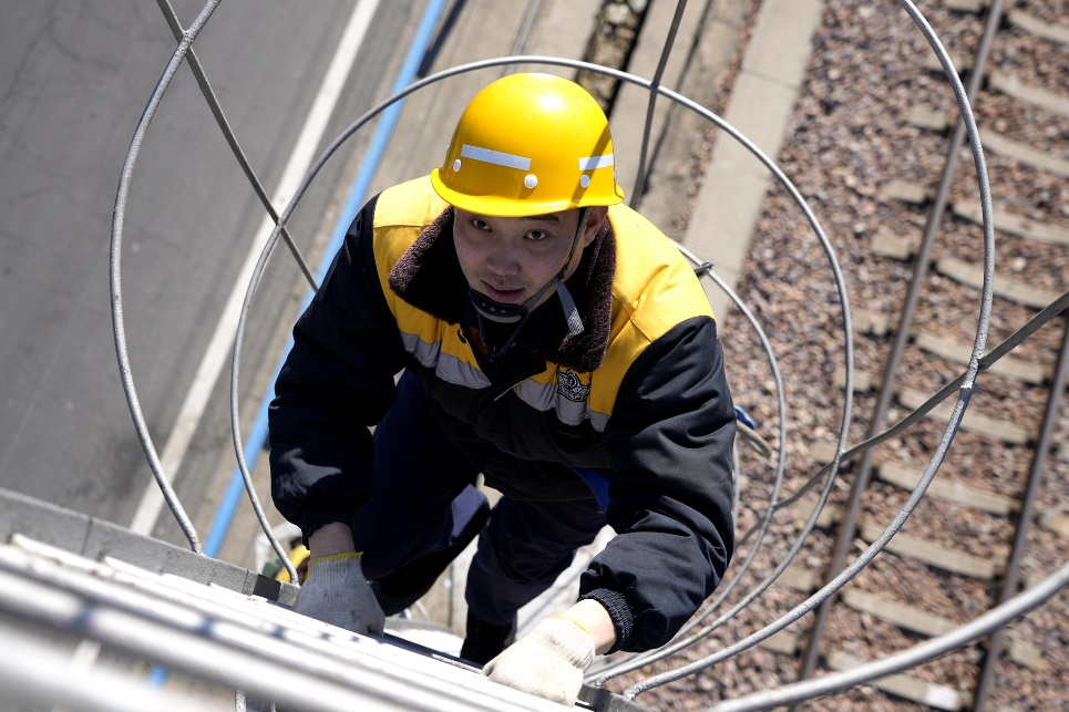 圖為鄭州供電段職工攀登20多米高的燈橋開(kāi)展工作。