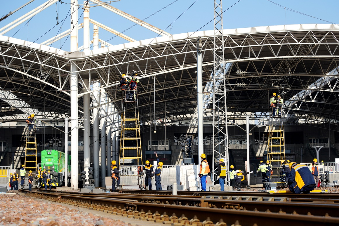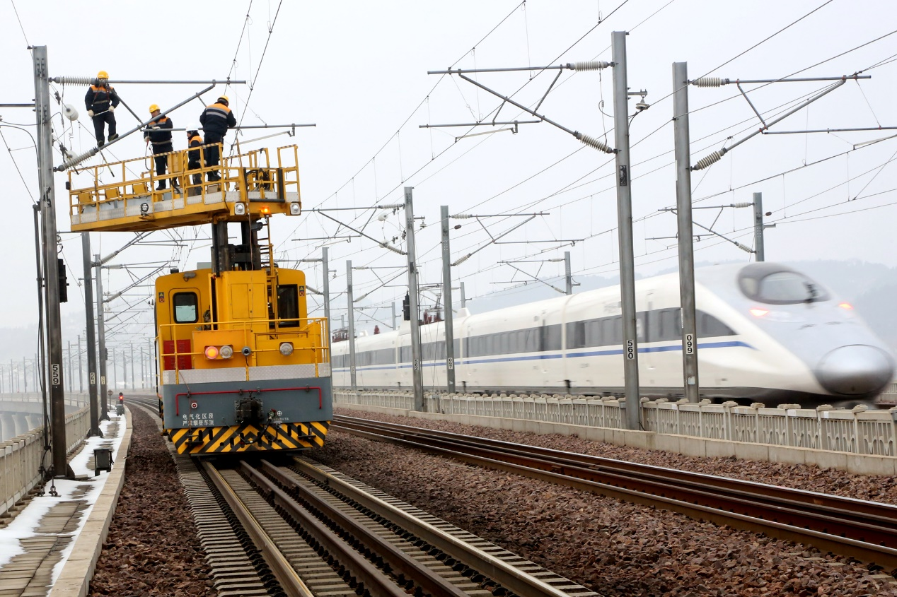 圖為鄭州供電段職工利用接觸網(wǎng)幾何參數(shù)智能檢測(cè)裝置對(duì)接觸網(wǎng)設(shè)備進(jìn)行測(cè)量。