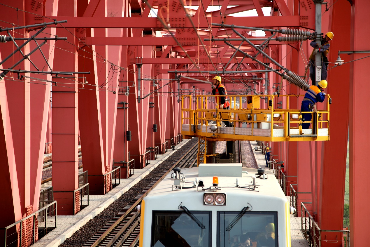 圖為鄭州供電段職工在京廣線黃河大橋上對(duì)接觸網(wǎng)設(shè)備進(jìn)行檢查。