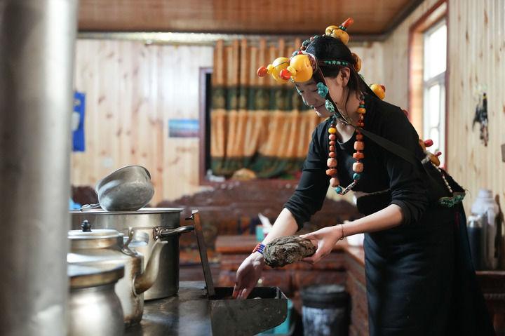 1月30日,在青海省玉樹藏族自治州雜多縣結(jié)多鄉(xiāng)達(dá)俄村,牧民塔加的女兒在鐵爐里添加牛糞。新華社記者 張龍 攝