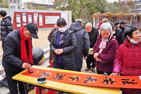 原來,當(dāng)天是三二五村的“新春送對聯(lián)”活動日。8時30分,村頭紅色文化廣場上已聚了不少人,書法家揮毫題聯(lián),觀眾喝彩聲不斷。匆匆趕來的黎伯忙前忙后,幫村里人布好紅紙,又用帶來的青磚壓住未干的春聯(lián)防止被風(fēng)吹跑。