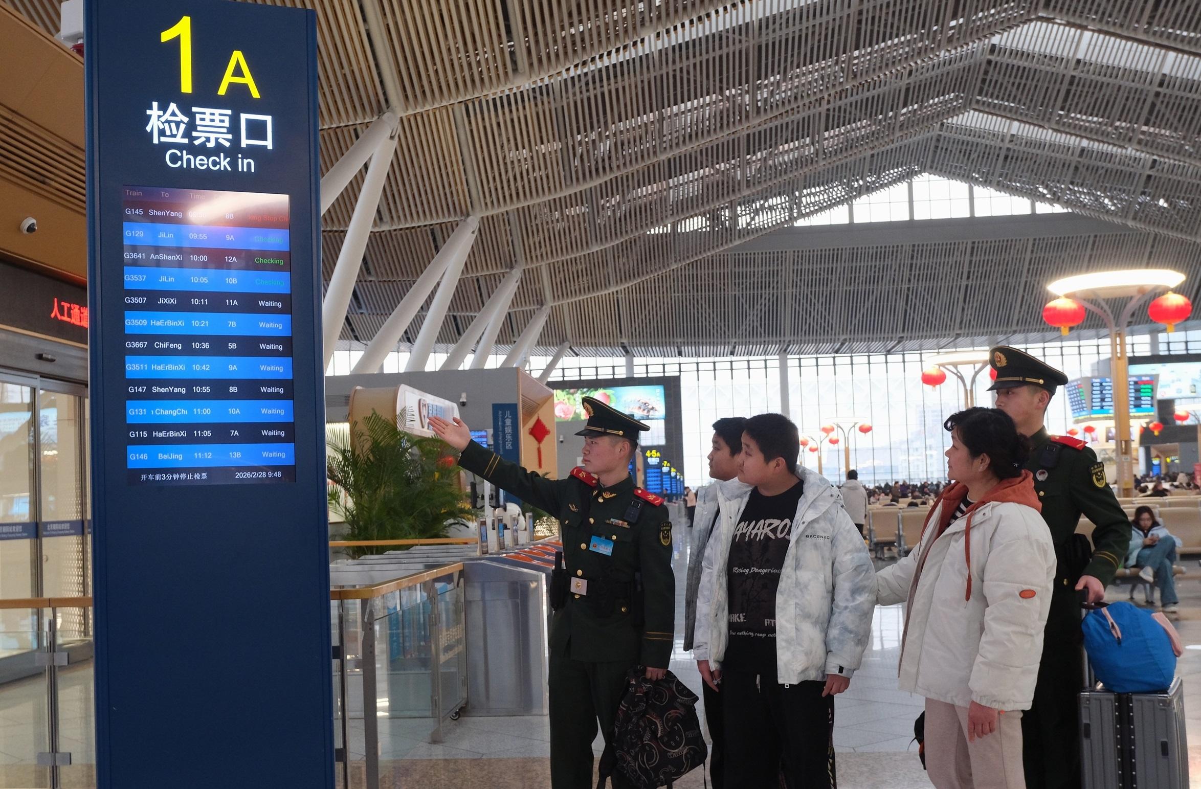 春運的早晨,北京朝陽站人流如織?!巴?,幫我看看這趟列車應(yīng)該在哪等???”“您跟我來,我?guī)??!?/p>