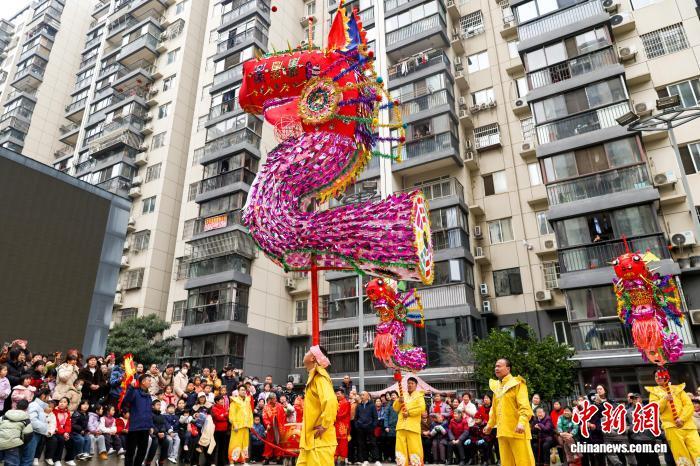 2月27日,湖北武漢,國家級非遺漢陽高龍走進社區(qū)進行表演,以傳統(tǒng)民俗為居民送上馬年元宵祝福。圖為高龍隊隊員們?yōu)榫用襁M行表演。中新社記者 張暢 攝