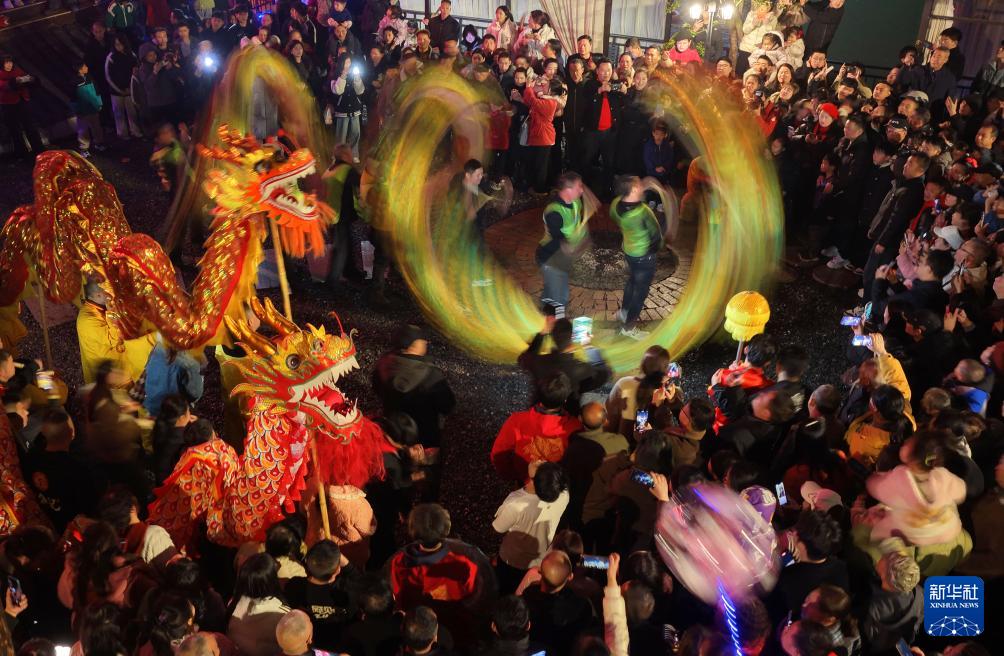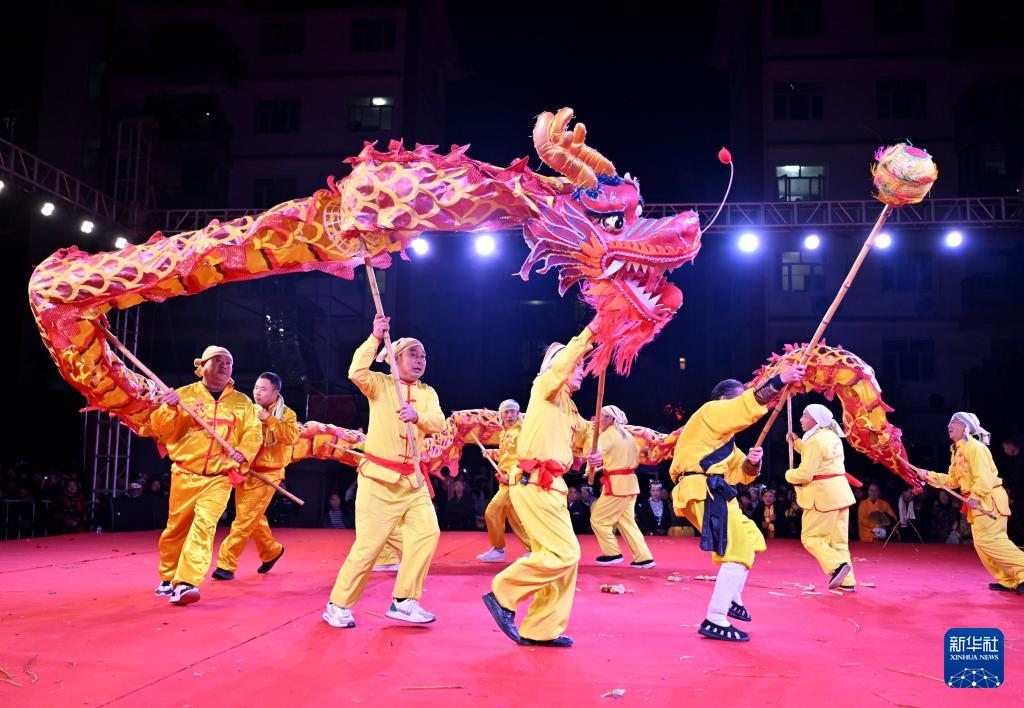 2月27日,村民在湖北省宣恩縣高羅鎮(zhèn)歌樂(lè)城社區(qū)進(jìn)行舞龍表演。