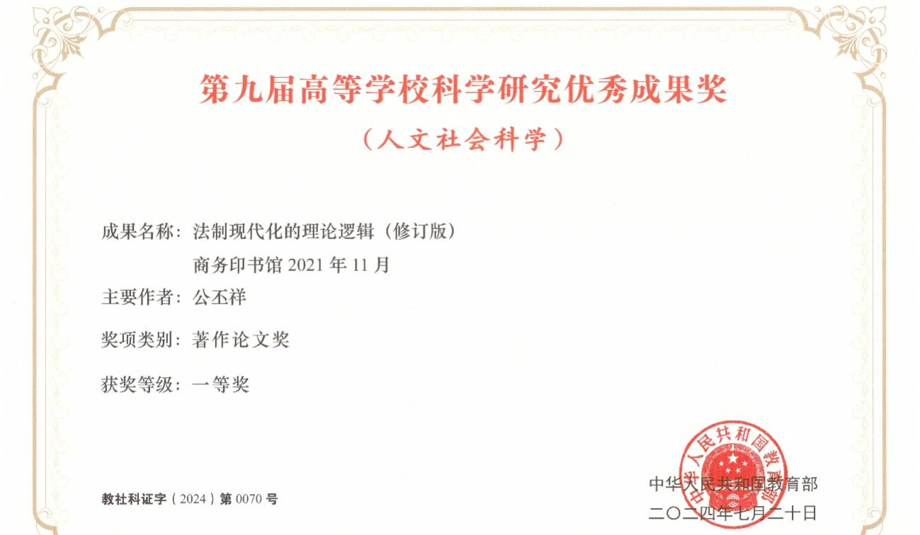 《法制現(xiàn)代化的理論邏輯(修訂版)》榮獲第九屆高等學(xué)??茖W(xué)研究?jī)?yōu)秀成果獎(jiǎng)一等獎(jiǎng)