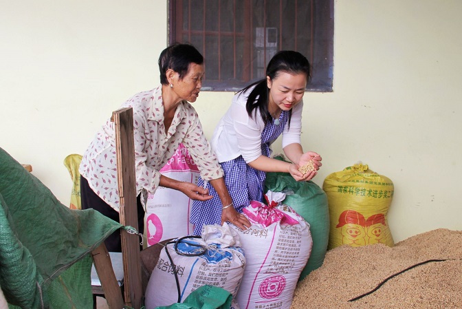 楊愛蘭在董家灣村淡昭軍家查看農(nóng)作物收成