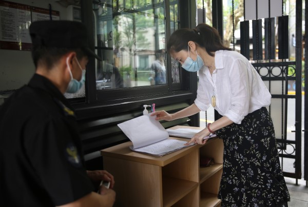 馬當路278弄,西成里大門口,黃浦區(qū)人大代表、淮海中路街道西成居委會主任戴瑾正在跟門衛(wèi)袁師傅核對進入人員信息。