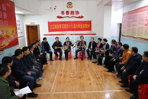 “琵琶到手歌就唱,講個黨的故事給你聽,六中全會精神拿來唱……”11月19日,在廣西壯族自治區(qū)柳州市三江侗族自治縣政協(xié)辦公室,政協(xié)機關干部和部分政協(xié)委員在富有侗族特色的琵琶歌中領悟黨的十九屆六中全會精神。 梁克川 攝