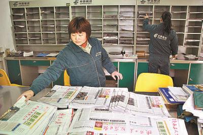 趙明翠每次投遞的報(bào)刊重達(dá)幾十公斤,分揀量很大。圖為她正在對(duì)要投遞的報(bào)刊進(jìn)行分揀。