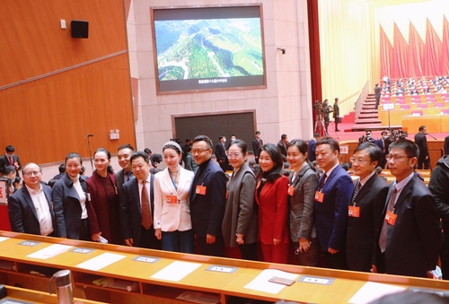 1月19日,在湖南省政協(xié)十二屆五次會(huì)議期間,委員們利用休息間隙在會(huì)場內(nèi)合影留念,在他們身后的大屏幕上,畫面定格在湖南的綠水青山,與合影委員一道組成了會(huì)場的靚麗“風(fēng)景”。王雙 攝