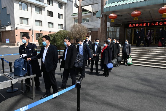 全國人大代表抵達(dá)駐地賓館——中國職工之家,并做核酸檢測。