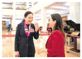 ▲ 全國人大代表、中華全國律師協(xié)會副會長李亞蘭(左)與全國人大代表、廣東百浩律師事務(wù)所主任黎霞交流履職感受。 本報記者 王建軍 攝