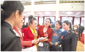 ▲ 全國人大代表、陜西省律師協(xié)會副會長方燕(右三)與女代表們就如何保障婦女兒童合法權(quán)益進行交流。 本報記者 王建軍 攝