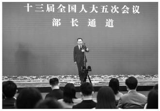 ▲ 3月8日,十三屆全國人大五次會議舉行第二場“部長通道”采訪活動。圖為本報記者通過網(wǎng)絡(luò)視頻方式向水利部部長李國英提問。
