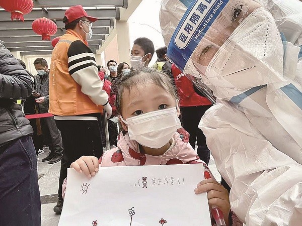張智華委員所在的上海易瑞生物科技有限公司全員拉上了核酸檢測(cè)的“火線”。張委員告訴了我們這樣一個(gè)故事:“這幾天,我們蹲點(diǎn)周浦傅雷圖書(shū)館和社區(qū)為市民提供免費(fèi)檢測(cè)服務(wù)。昨天(19日)有位EVA小朋友在做完核酸檢測(cè)后,獻(xiàn)上自己畫(huà)作給我們的‘大白’,還特別寫(xiě)上了‘醫(yī)生辛苦了’,大家都說(shuō)一身的疲憊感瞬間消失殆盡!”